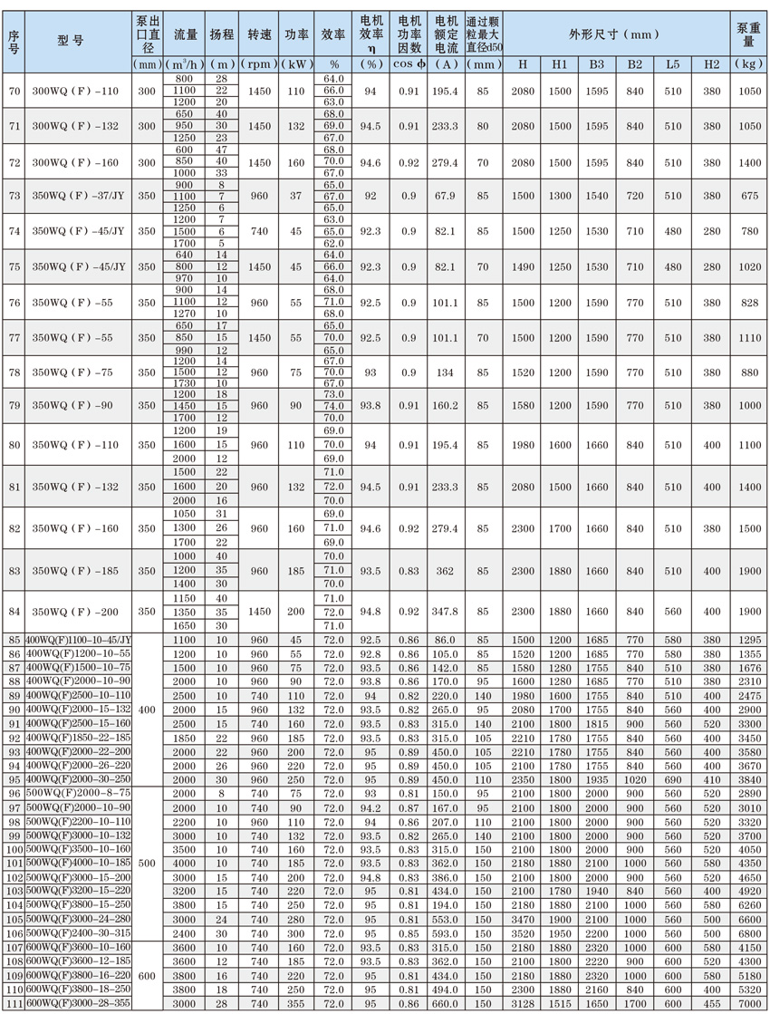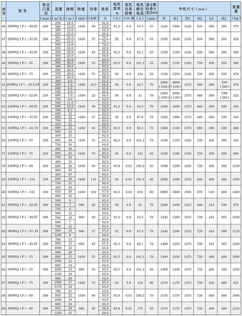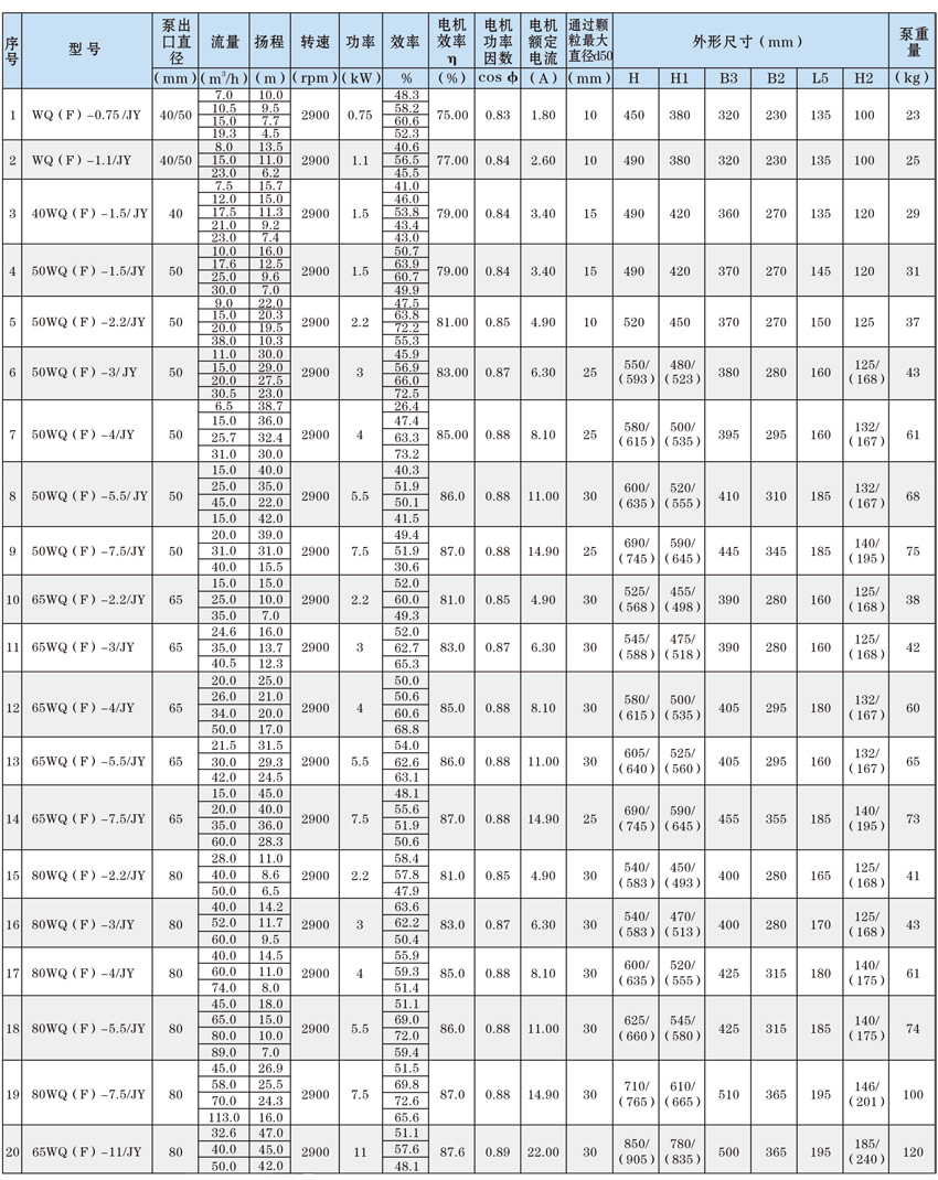 為了使WQ(F/JY)系列潛水污水泵以更好的可靠性、更高的機(jī)組效率服務(wù)于客戶,在總結(jié)25年生產(chǎn)制造該系列泵的經(jīng)驗(yàn)積累的基礎(chǔ)上,再一次更新優(yōu)化了水力模型,創(chuàng)新機(jī)械密封、軸承結(jié)構(gòu),采用優(yōu)質(zhì)電機(jī)材料,根據(jù)使用環(huán)境條件,18.5kW及以上泵對(duì)電機(jī)循環(huán)冷卻,保證可靠性。全系列共111個(gè)基本規(guī)格,通過使用原型葉輪和改型葉輪及其切割,在型譜性能范圍內(nèi),可提供恰當(dāng)滿足用戶所需要的任意流量、揚(yáng)程工作點(diǎn)的水泵。